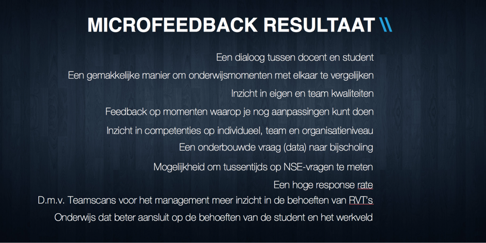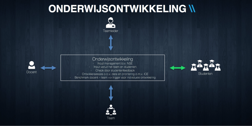 Door deze verbeterslagen op de juiste manier met de studenten te communiceren en door te voeren, ontstaat er verbinding tussen de docenten, de studenten en het management. Met het gezamenlijke doel: kwaliteitsverbetering van het onderwijs